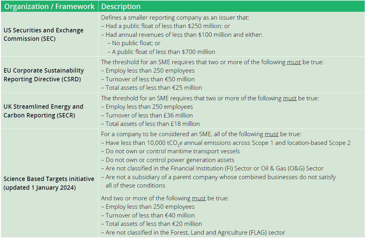 There is not currently one generally recognized definition of what constitutes an SME. Different regulatory agencies and standards around the world maintain different definitions. In order to take advantage of the additional year available to comply with updated requirements, organizations should evaluate themselves as an SME only under an appropriate and aligned standard. For example, an EU-based organization may consider the requirements of the EU Corporate Sustainability Reporting Directive (CSRD) the most appropriate due to geographic alignment and their existing classification for regulatory ESG reporting.