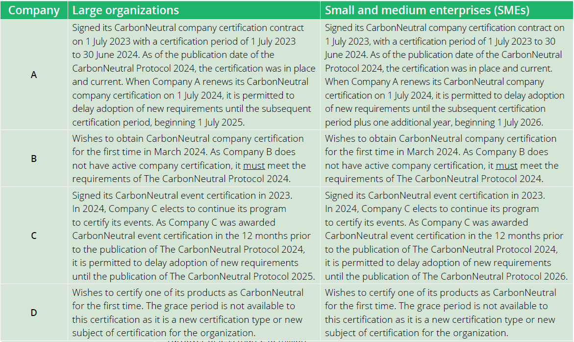 For small companies, which often have more limited resources, this is especially true. As a result, organizations which hold active certification and are considered an SME, will be permitted one year to comply with the new requirements implemented within this version of The CarbonNeutral Protocol, in addition to the grace period specified above. Illustrative examples of the application of the grace period for SMEs are shown in Table 2.