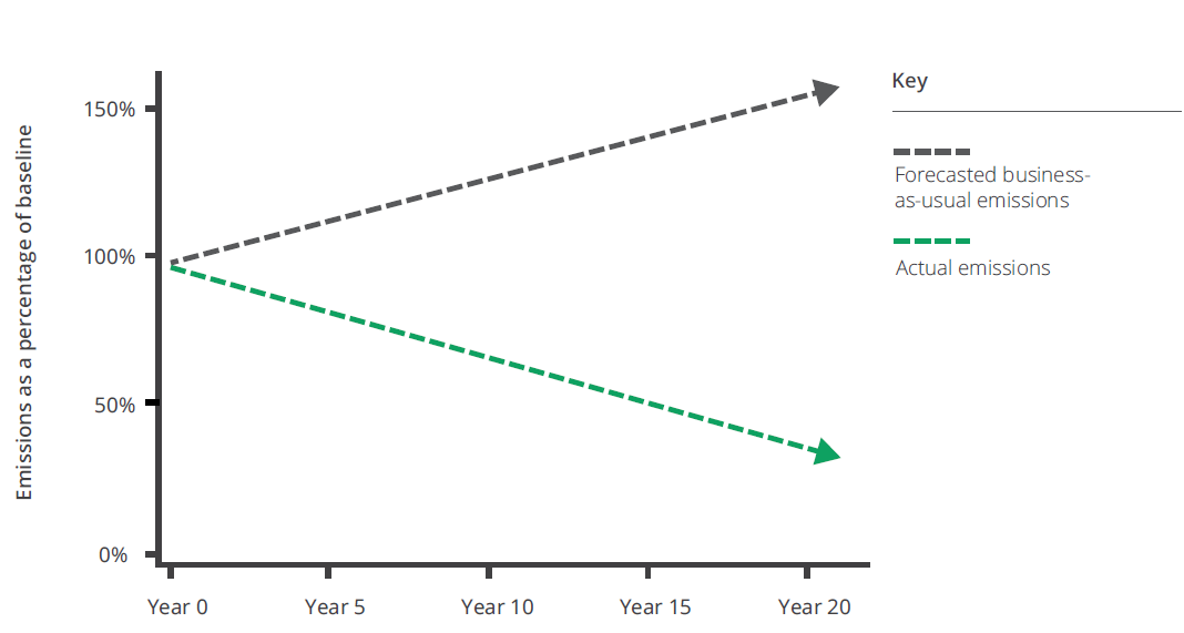 The organization must set a short-term science-aligned internal abatement target to ensure the subject’s emissions decrease over time. The target may be expressed as an absolute GHG emission reduction or as a decrease in GHG intensity, with absolute GHG reduction targets preferred. An example of an absolute GHG reduction target is demonstrated in Figure 2. The organization is encouraged to set a long term abatement target and net zero commitment.