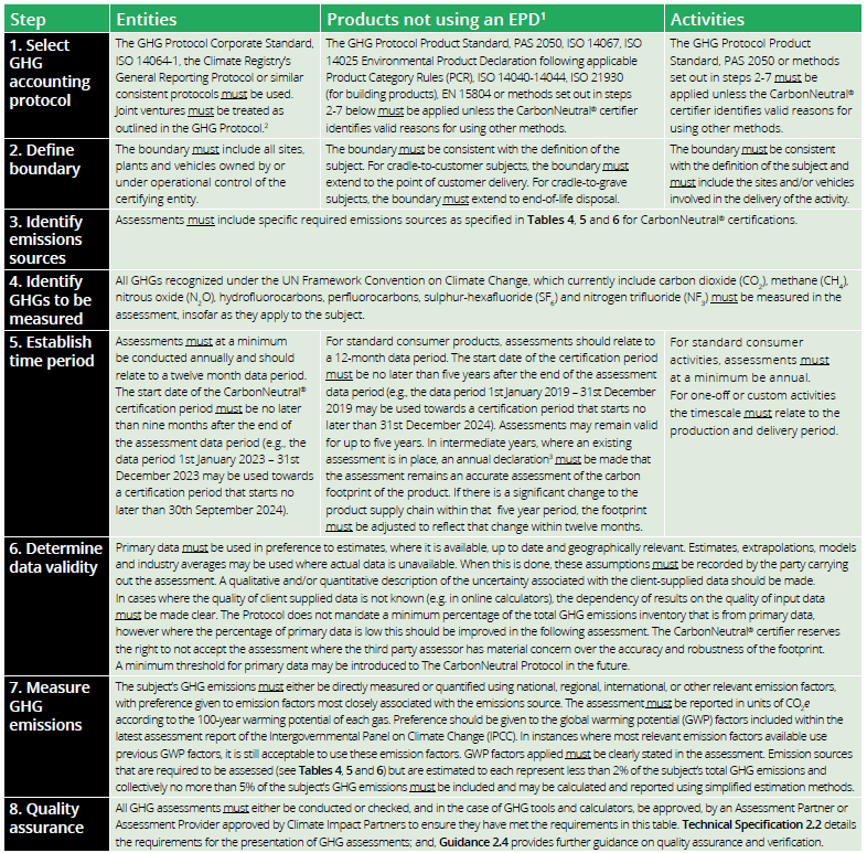 This section in the Technical Specification provides requirements and guidance for the GHG emissions data required for assessments provided to support CarbonNeutral® certifications for the defined subject. A GHG Assessment for the defined subject must be undertaken and provided to the certifier. The requirements of the GHG Assessment are detailed in Table 8 and Technical Specifications 2.2. Figure 7 summarizes how emissions assessments are determined to have met the requirements of The CarbonNeutral Protocol.