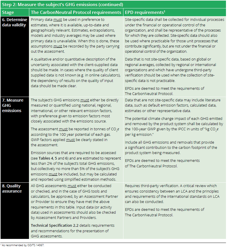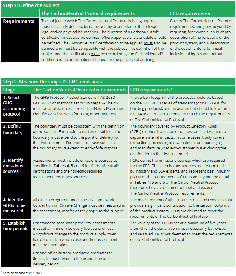 There may be minor differences in requirements of The CarbonNeutral Protocol relative to an EPD. EPD product category rules for any given subject will by definition be more relevant to the subject than the general requirements of The CarbonNeutral® product certification. Therefore, where there are differences, the EPD prevails and is deemed to have met the requirements of The CarbonNeutral Protocol. Table 9 explores some of these requirements in more detail.